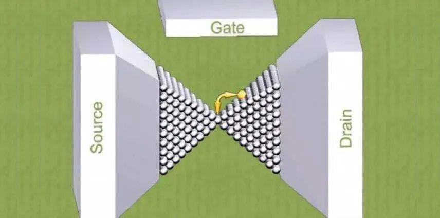 在單原子晶體管中,通過(guò)源極和柵極之間的電壓移動(dòng)單個(gè)原子,從而關(guān)閉或打開源極和漏極之間的電路。